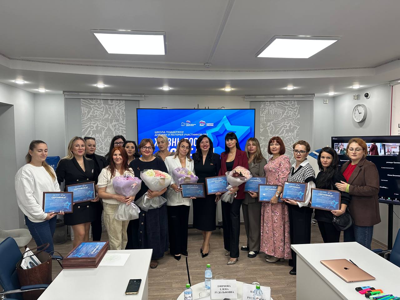 Особое место в программе заняла торжественная церемония награждения. Благодарственными письмами за вклад в организацию и проведение проекта были отмечены психологи и активные помощницы: Елена Рудольфовна Ефимова, Любовь Фёдоровна Исаева, Оксана Викторовна Бородина и Лилия Ильдаровна Култышева. Более 20 женщин получили именные сертификаты об окончании Школы. Для участниц, проходивших обучение в онлайн-формате, сертификаты будут переданы через муниципальные штабы общественной поддержки и вручены на местах, чтобы каждая из них почувствовала себя частью единой команды.